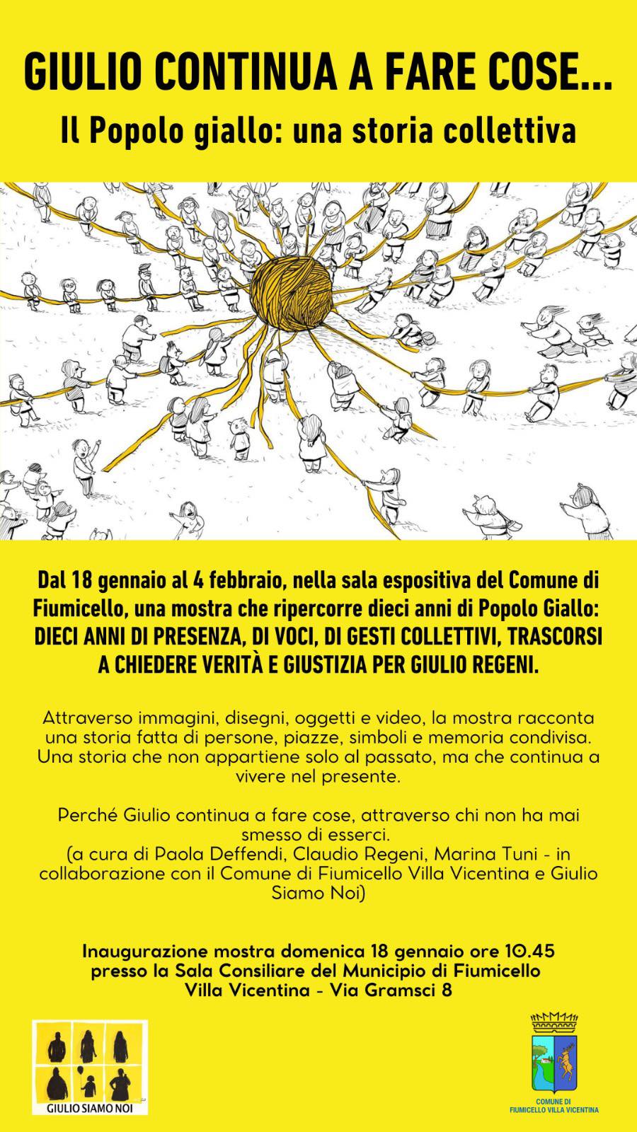 Dal 18 gennaio al 4 febbraio, nella sala espositiva del Comune di Fiumicello, una mostra che ripercorre dieci anni di Popolo Giallo:DIECI ANNI DI PRESENZA, DI VOCI, DI GESTI COLLETTIVI, TRASCORSI A CHIEDERE VERITÀ E GIUSTIZIA PER GIULIO REGENI.